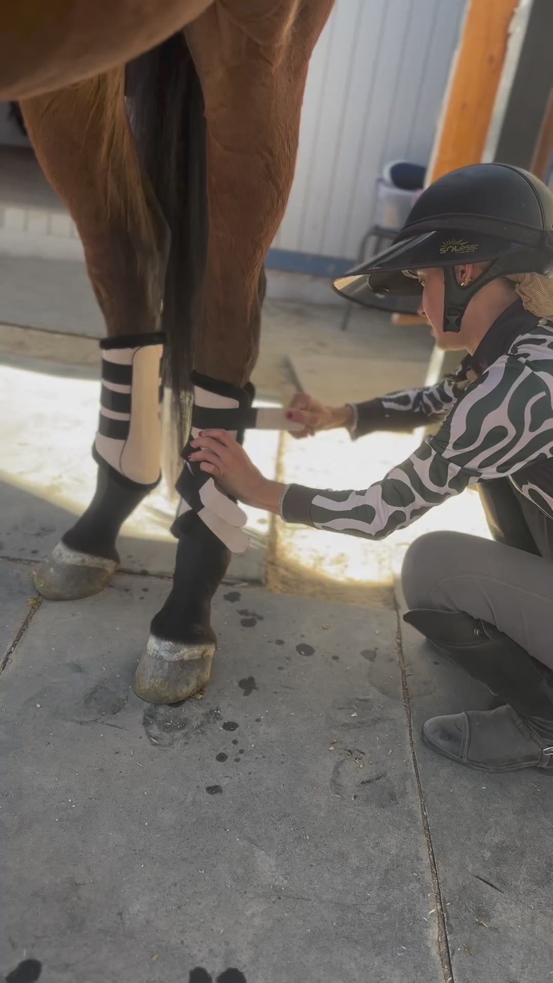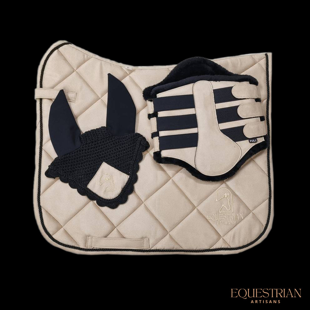 Enhance your horse's grooming routine with our bundle featuring Cream Suede Brushing Boots, a Cream Fly Veil, and a Cream Suede Saddle Pad. The Cream Suede Brushing Boots provide the perfect fit with flexible straps and are tailored for horses with black faux fur. Crafted from premium suede material, these boots ensure comfort and longevity. The Cream Fly Veil offers superior protection against flies and insects with its stylish design and adjustable fit. Pair it with our matching beige saddle pad and brushing boots for a coordinated look. The Cream Suede Saddle Pad, crafted from high-quality suede material, combines elegance with durability. Its precision stitching and anatomical design prioritize your horse's comfort. Elevate your equestrian style with this bundle and let your horse's elegance shine.